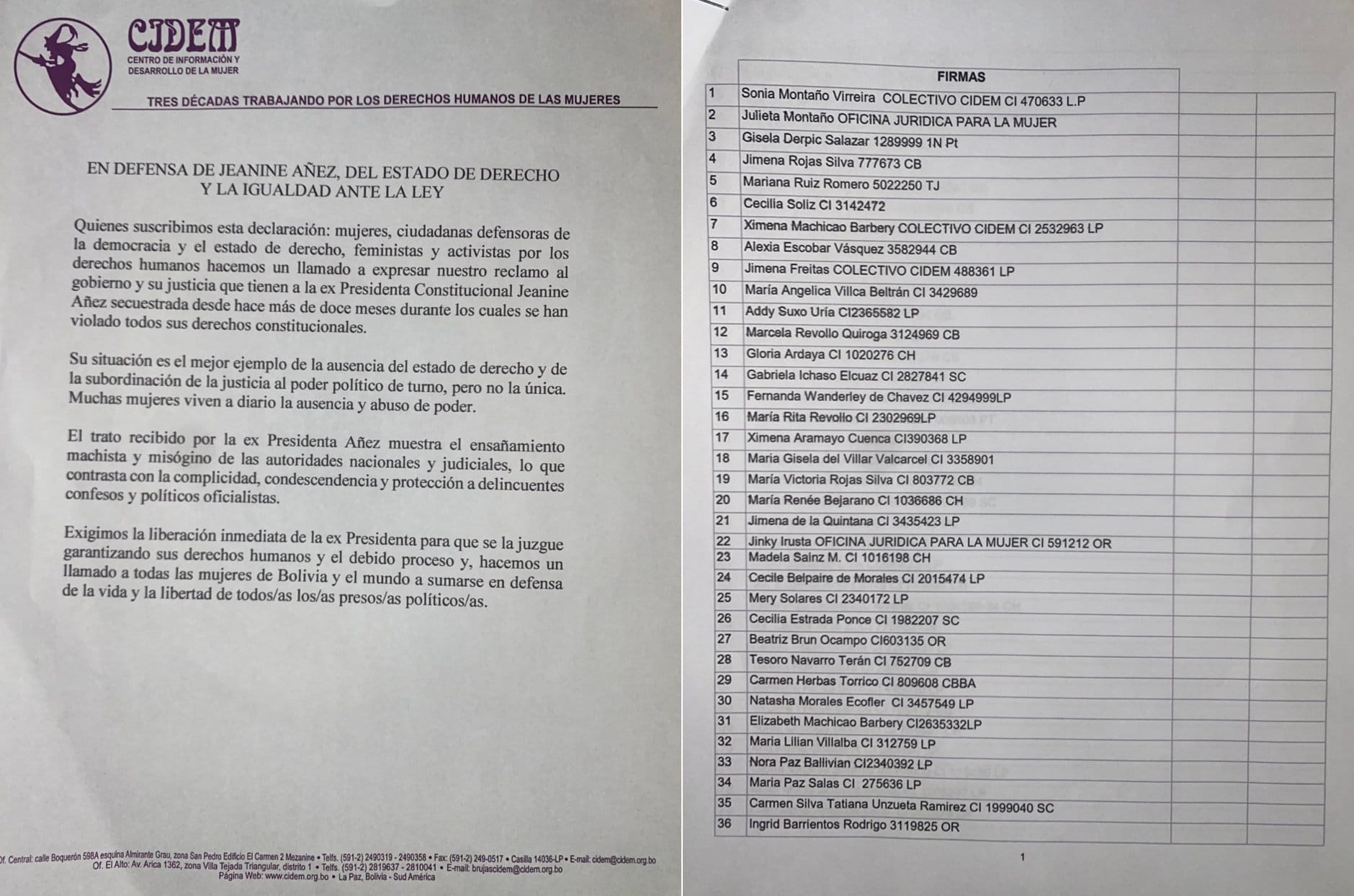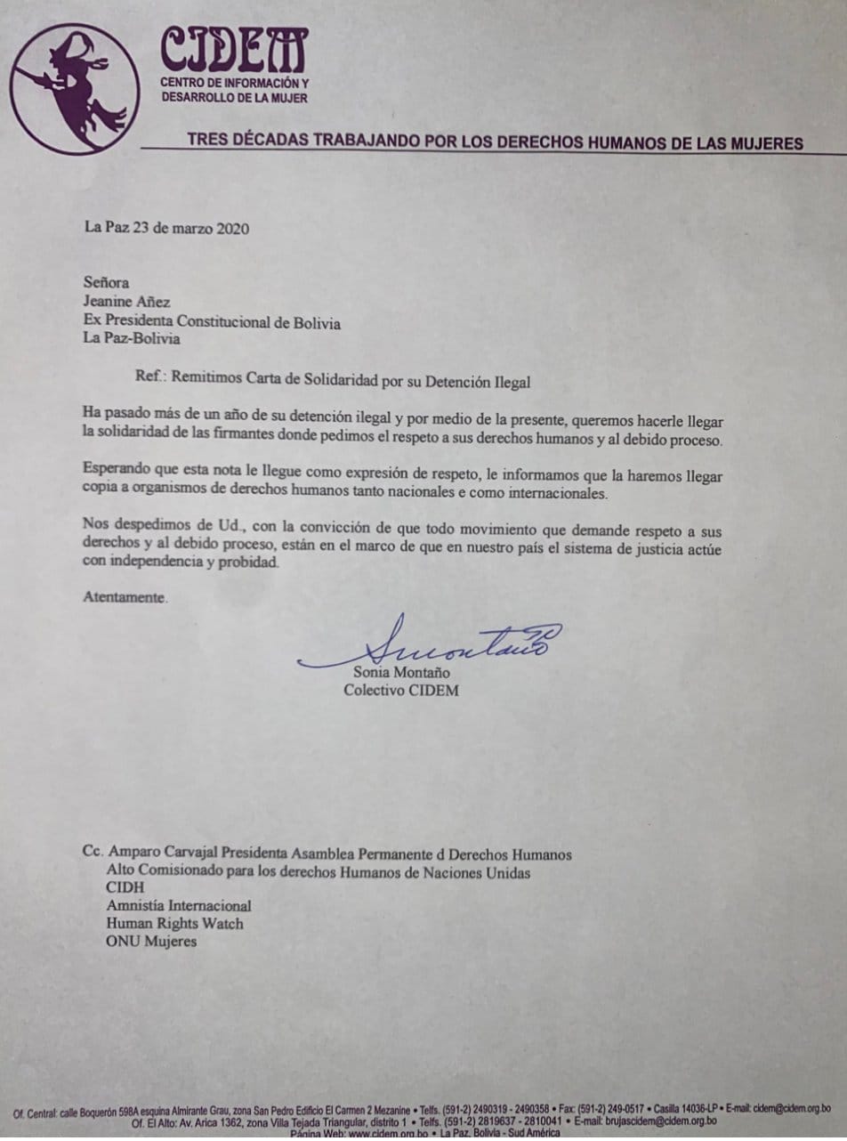 La expresidenta Jeanine Añez agradeció a las firmas solidarias, valerosas y presentes que le hicieron llegar un pronunciamiento, en momentos que asegura son duros e injustos.