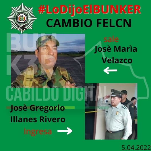El Comando General de la Policía releva al coronel José María Velasco como director nacional de la Fuerza Especial de Lucha Contra el Narcotráfico (FELCN). En su remplazo asume el coronel José Gregorio Illanes.