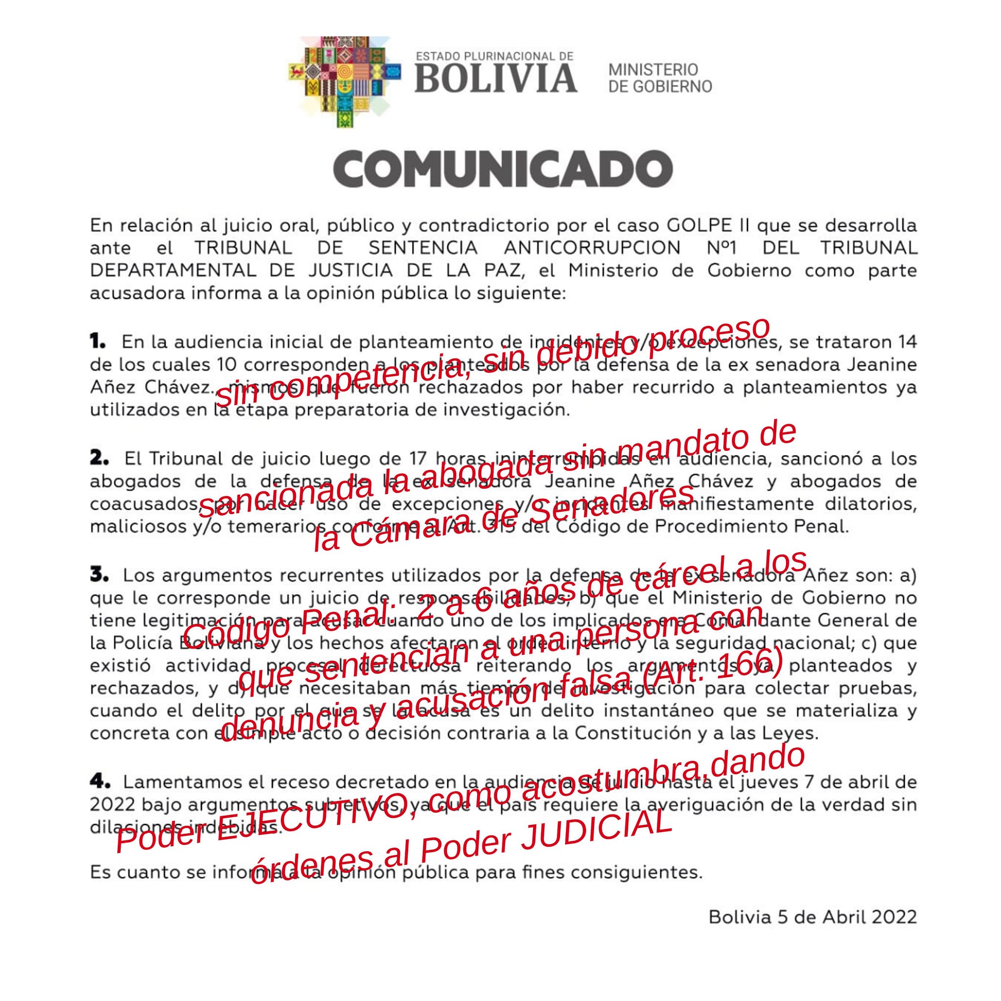 La hija de Jeanine Añez, Carolina Ribera, envió una carta al relator Diego García-Sayán, al Tribunal Supremo de Justicia y a la comunidad internacional, donde denuncia que el gobierno obliga a 3 jueces sin competencia a sentenciar a su madre en un proceso que calificó como «ilegal de principio a fin».