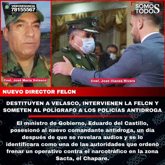 Después de una serie de denuncias de “irregularidades”, se destituyó al director de la Fuerza Especial de Lucha Contra el Narcotráfico (FELCN) Cnel. José María Velasco. El ministro de Gobierno, Eduardo del Castillo, posesionó al nuevo comandante antidroga, el Cnel. José Illanes y se ordenó intervenir la fuerza, someter a la prueba del polígrafo al 100% de uniformados antidroga y renovar el Alto Mando y jefaturas.