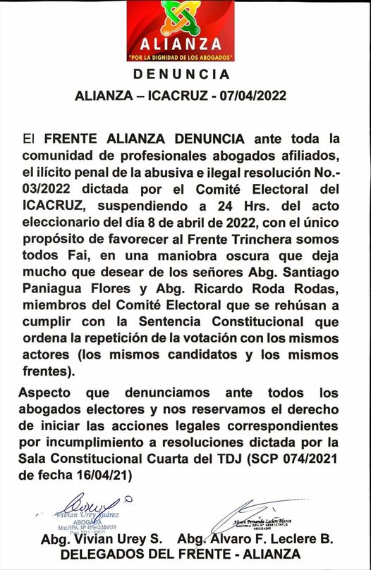 El Frente Alianza denunció que el Comité Electoral del Ilustre Colegio de Abogados de Santa Cruz suspendió el acto eleccionario faltando 24 horas, consideran que el objetivo fue favorecer al Frente Trinchera Somos Todos FAI.