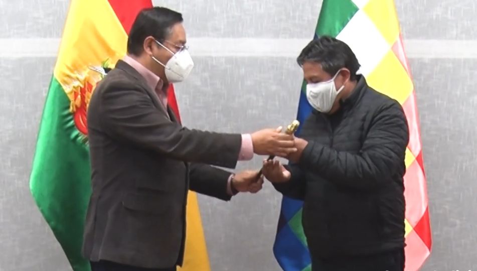 Presidente Arce antes de viajar a #Argentina entregó el Bastón de Mando al Vicepresidente, David Choquehuanca