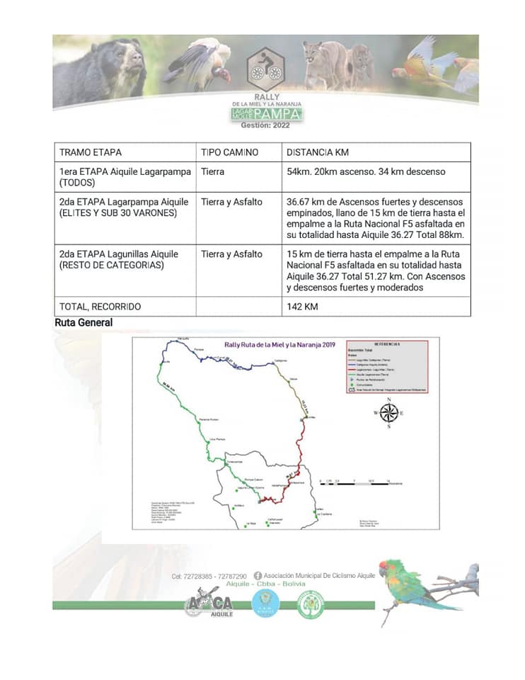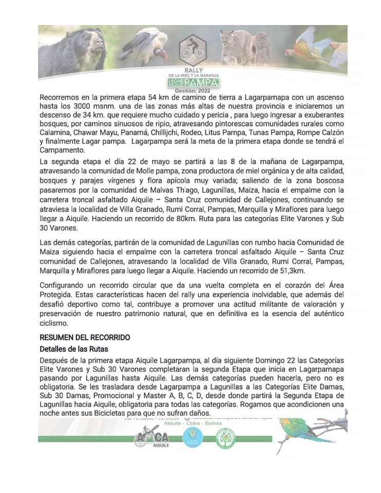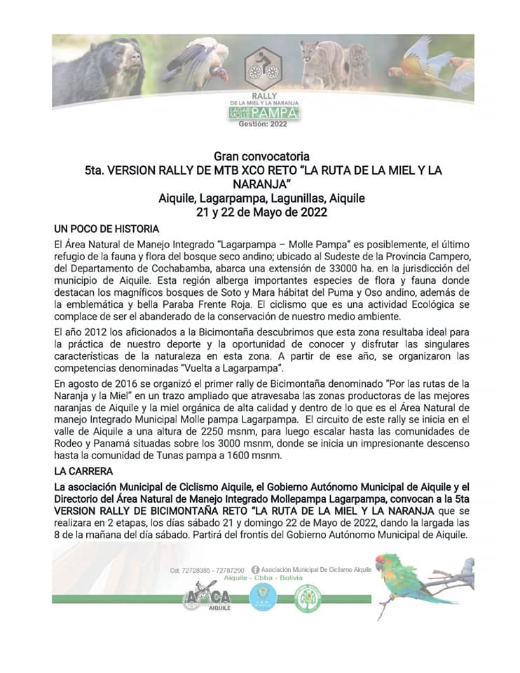La Asociación Municipal de Ciclismo Aiquile y el Gobierno Autónomo Municipal de Aiquile invita a toda la población en general a participar de la carrera ciclista en su 5ta versión de Rally MTB «Ruta de la miel y naranja» que se llevara a cabo el 21 y 22 de mayo.