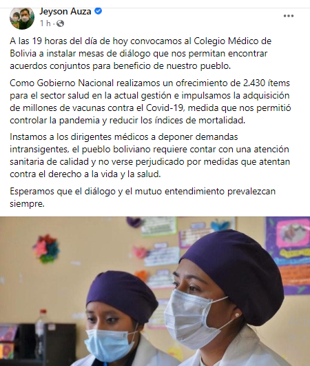 🔵#ANF | #Política El ministro de Salud, Jeyson Auza, comunicó que convocó al Colegio Médico de Bolivia a instalar el diálogo hoy a las 19:00. Señaló que como Gobierno ofrecieron al sector salud 2.430 ítems e instó a los galenos “a deponer demandas intransigentes”. https://t.co/e7RbQq8h7k