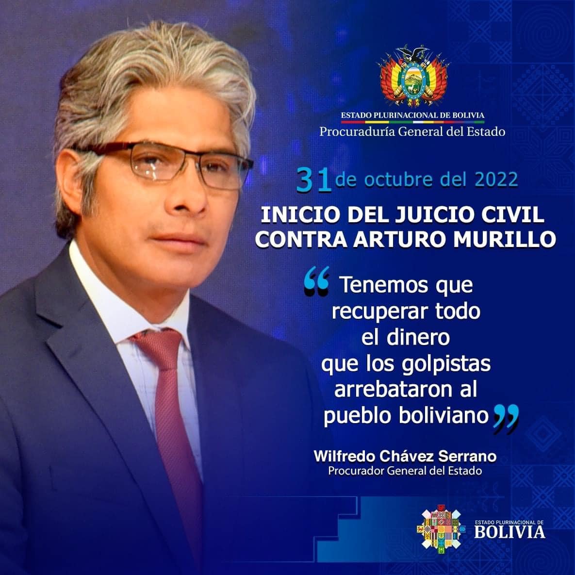 “Tenemos que recuperar todo el dinero que los golpistas arrebataron al pueblo boliviano”, se lee en parte del Comunicado, en el que aparece el Procurador General del Estado, Wilfredo Chávez Serrano.