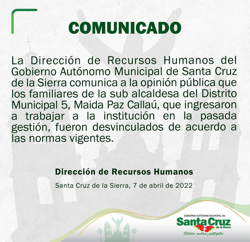 La Dirección de Recursos Humanos de la Alcaldía de Santa Cruz informó que los familiares de subalcaldesa del Distrito 5, Maida Paz, que ingresaron a trabajar a la institución el año pasado, fueron desvinculados. Esto se da luego de las acusaciones de nepotismo realizadas por algunos concejales opositores contra la subalcaldesa.