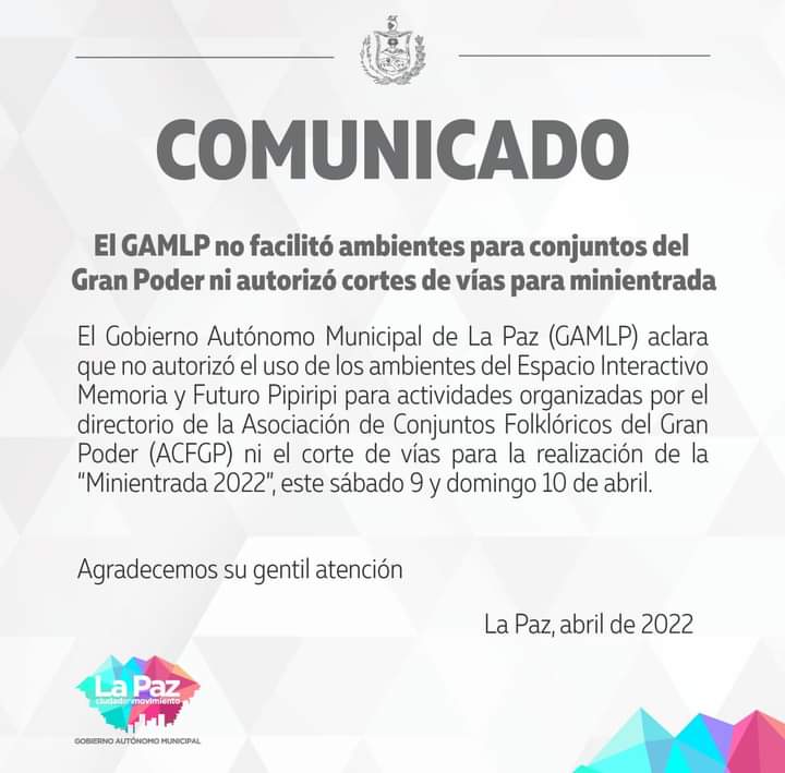 🔵 #Ultimo | La @LaPazAlcaldia aclara que no facilitó ambientes del Pipiripi para actividades del directorio de la Asociación de Conjuntos Folklóricos del Gran Poder, ni el corte de vías para una «Minientrada 2022». https://t.co/1P3XKlc0t2