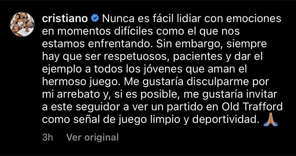 Cristiano Ronaldo ofrece disculpas a fan al que le aventó el celular y lo invita a un partido.