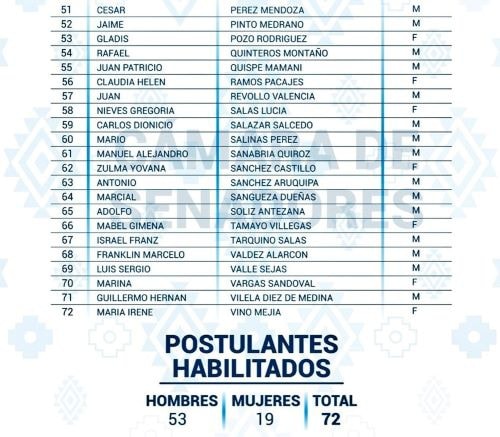 72 personas fueron las inscritas, entre ellas abogados, estudiantes, comunicadores, maestros y administradores, de ellos hay 53 varones y 19 mujeres.