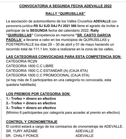 Adevalle Santa Cruz Bolivia que tiene como presidente a Justo Alex Leon Valencia y de vice a Gutierrez Rojas Leiner lanzaron la convocatoria para la segunda fecha de la temporada 2022. Se viene el rally, Quirusillas 29-30 de abril y 01 de mayo
