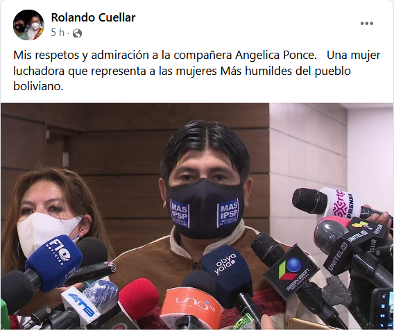 «Mis respetos y admiración a la compañera Angelica Ponce. Una mujer luchadora que representa a las mujeres Más humildes del pueblo boliviano», expresó.