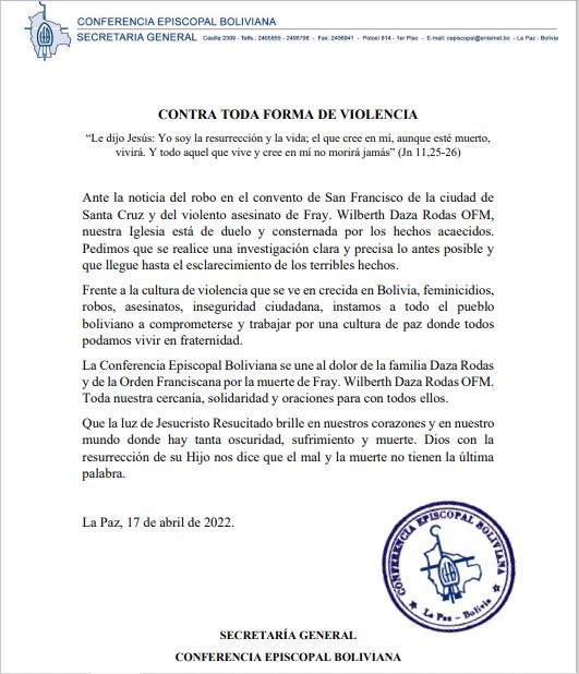 🔵#ANF | #Sociedad La Conferencia Episcopal Boliviana pide que se realice una investigación minuciosa y se encuentren a los autores del asesinato del fray Wilberth Daza. Ante la crecida de la ola de violencia, convocan a la población a trabajar por una cultura de paz. https://t.co/wtbN1pToby