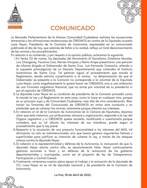 CC responde a las acusaciones de Creemos sobre la diputada Luisa NayarCategorías NoticiasEtiquetas , Detrás de la Verdad, Facebook 18/04/2022 Fuente: Detrás de la Verdad