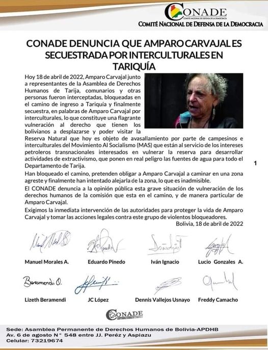 #Conade denuncia secuestro de Amparo Carvajal, por interculturales en #TarijaCategorías NoticiasEtiquetas , Agustín Zambrana en El Bunker, Facebook 18/04/2022 #Conade denuncia secuestro de Amparo Carvajal, por interculturales en #Tarija Fuente: Agustín Zambrana en El Bunker => Recibir por Whatsapp las noticias destacadas