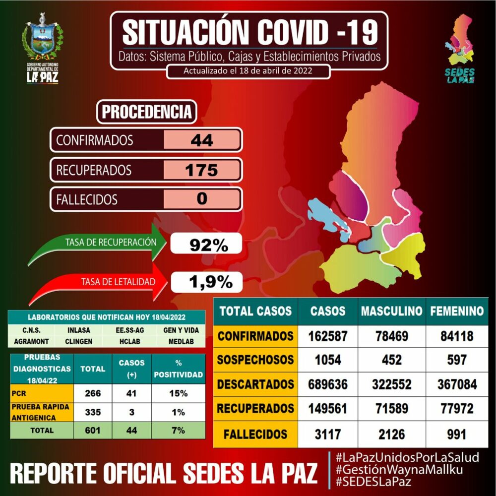 🔵#ANF | #Salud El Sedes de #LaPaz informa que esta jornada se registraron 44 nuevos casos de #COVID19 y 175 personas recuperadas en el departamento paceño. Hoy no se reportan fallecidos. pic.twitter.com/ggKke9wWHv