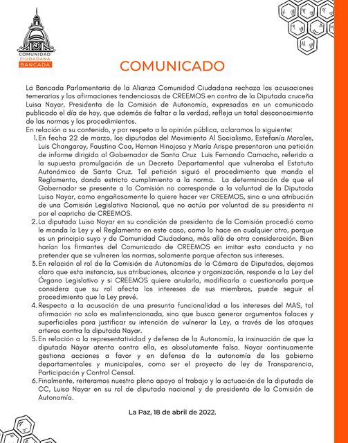 Comunicado de #CC sobre petición de Informe Oral al Gobernador de Santa Cruz, #LuisFernandoCamacho 👇