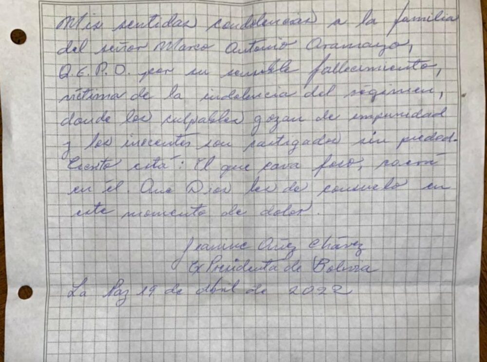 🔵 #ANF | A través de una nota, difundida por su cuenta de #Twitter, @JeanineAnez envió sus condolencias a la familia de Marco Aramayo "víctima de la indolencia del régimen, donde los culpables gozan de impunidad y los inocentes son castigados sin piedad". pic.twitter.com/Ggo4XAcIlL