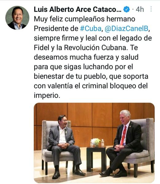 «Siempre firme y leal con el legado de de Fidel y la revolución cubana», fueron las palabras del presidente Luis Arce al presidente de Cuba, Miguel Díaz Canel.