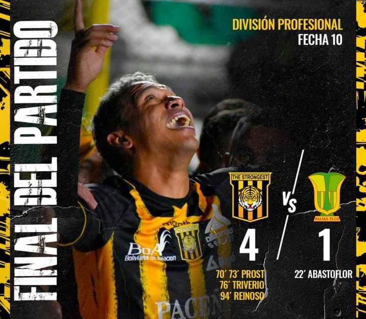 Hasta el minuto 70 del partido #atléticopalmaflor ganaba 1 a 0 al club #TheStrongest con gol de Freddy AbastoFlor. Los últimos 20 minutos más 4 minutos de adición el tigre rugió y marco 4 goles, doblete de Martín Prost, además de Triverio y Reinoso, dejando el resultado final 4 a 1. Sin embargo el equipo de Quillacollo sigue puntero en su grupo en la tabla de posiciones.