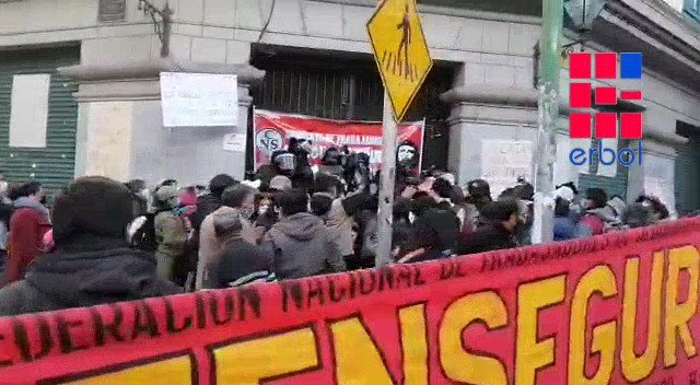 Trabajadores de la Caja Nacional de Salud cumplen paro de 72 horas en demanda de la destitución del Gerente General. Hubo forcejeos con policías y se instaló bloqueo en la avenida Mariscal Santa Cruz en el centro paceño. https://t.co/Y5CBaNQzjw