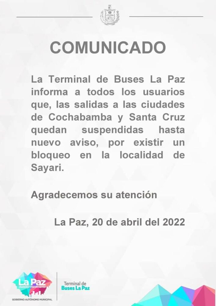 🔵 #Ultimo | La terminal de buses de #LaPaz anuncia que las salidas a #Cochabamba y #SantaCruz quedan suspendidas debido al bloqueo que realizan trabajadores mineros en el sector de Sayari. https://t.co/eWlQL2eNfs