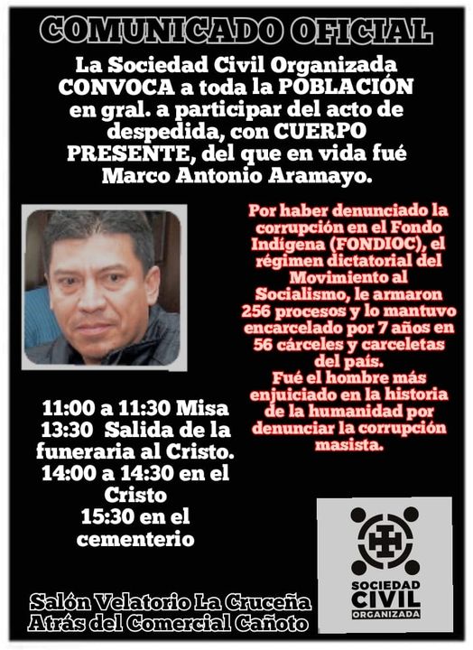 Convocatoria a la población a sumarse a la despedida de Marco Aramayo este jueves 21 de abril