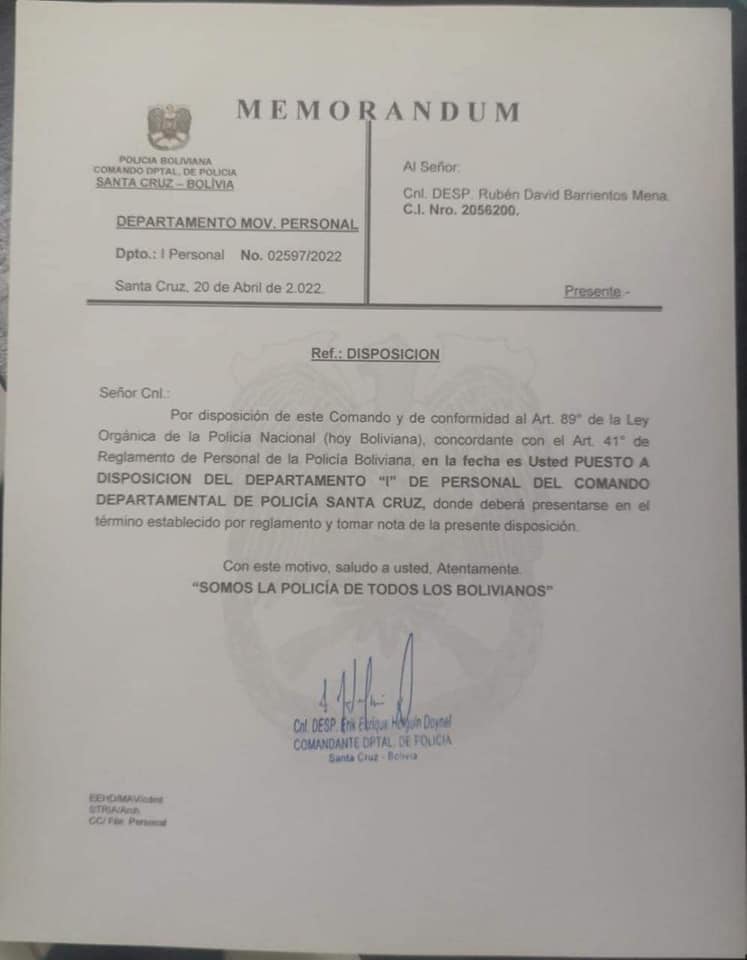 Tras haberse conocido que el Cnl. Ruben Barrientos uno de los hombres de confianza del ex ministro de Gobierno, Arturo Murillo, estaba ocupando el cargo de Comandante del Distrito policial Nro. 8 se conoció que el Comandante de la Policía en Santa Cruz, Cnl. Erick Holguín, destituyó de su cargo a Barrientos y lo puso a disposición de Comando Departamental de Santa Cruz.
