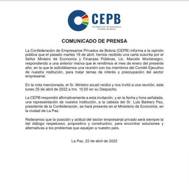 🔵 #ANF | #Economía La Confederación de Empresarios Privados de Bolivia (CEPB) confirma su asistencia a la reunión con el Ministerio de Economía para tratar temas que preocupan al sector privado. El encuentro está programado para este lunes a las 15:00. https://t.co/yLsqTwmrXg