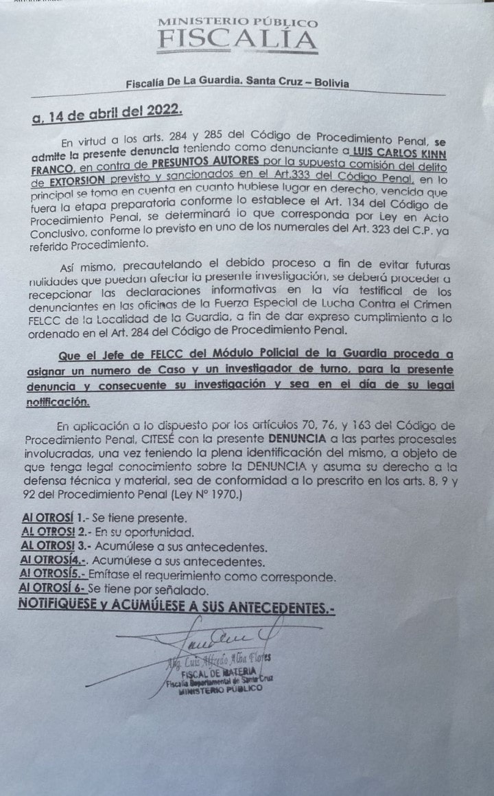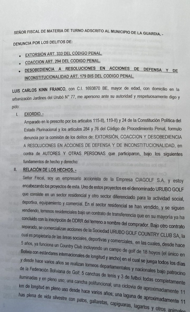 La Fiscalía admitió la denuncia penal interpuesta por Luis Carlos Kinn Franco, presidente del Directorio del Urubó Golf Country Club S.A. (UGCC S.A.), quien denunció extorsión y cohecho por parte de interesados en tomar el control del proyecto, valorado en más de 50 millones de dólares, y que utilizaron las redes