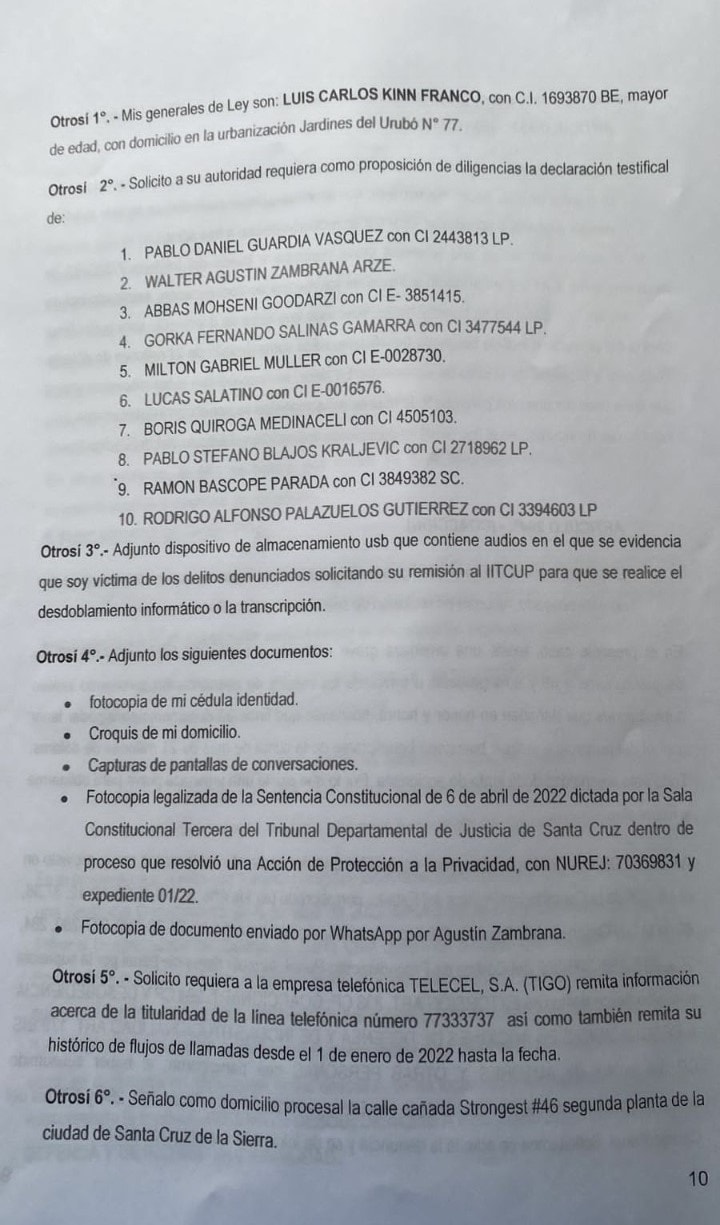 La denuncia penal fue admitida el pasado jueves 14 de abril. Como parte de las investigaciones, nueve copropietarios que residen en Urubó Golf y un abogado fueron llamados a declarar por la fiscalía de manera testifical. La lista la encabeza Pablo Daniel Guardia Vásquez, además de Agustín Zambrana Arze