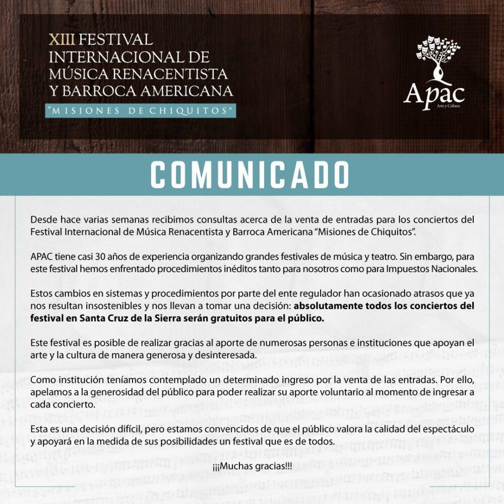 🔵 #ANF | Los organizadores del XIII Festival Internacional de Música Renacentista y Barroca Americana «Misiones de Chiquitos» informaron que por «procedimientos inéditos» de Impuestos Nacionales, se ven en la obligación de no cobrar entradas a sus eventos en #SantaCruz. https://t.co/5A3fEekSDc
