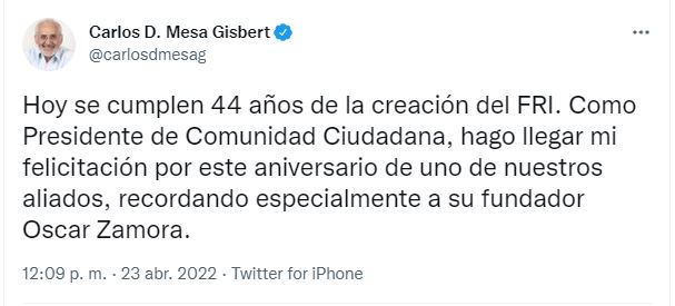 #ANF | #Política El Frente Revolucionario de Izquierda (FRI) celebra 44 años de creación, al respecto el expresidente @carlosdmesag felicitó a la organización política que es parte de la alianza de Comunidad Ciudadana. https://t.co/1YY6aPWN4K