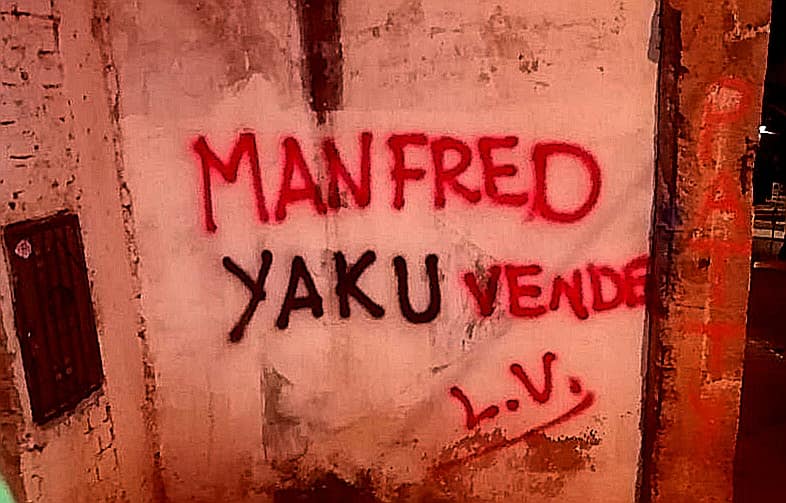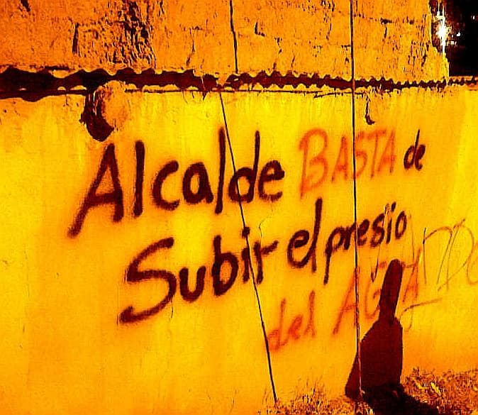 Son algunos mensajes que rechazan las políticas que pretende implementar el alcalde Manfred Reyes Villa en el Cercado de Cochabamba, los rechazos van recordando que en este mismo personaje político quiso negociar el agua de los Cochabambinos el pasado abril del año 2000, cuando Aguas del Tunari, intentó privatiza el agua potable de los Cochabambinos.