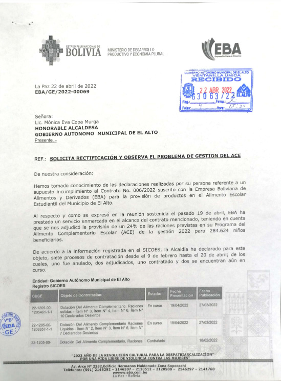 🔵#ANF | La Empresa Boliviana de Alimentos y Derivados (EBA) exigió a la alcaldesa de #ElAlto, Eva Copa que rectifique sus apreciaciones en contra de la empresa. Afirmó que desde esa instancia edil se registró fallas en la distribución del desayuno escolar.
