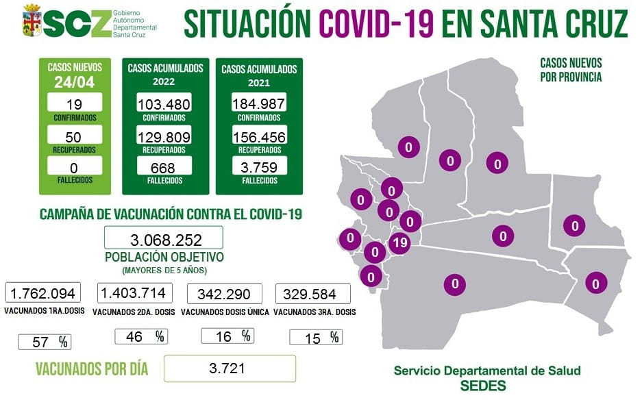 🔵#ANF | #Sociedad El Servicio Departamental de Salud de Santa Cruz reportó esta jornada 19 contagios de #COVID19, ningún deceso y 50 personas vencieron al virus. https://t.co/GmC2p2dLMH