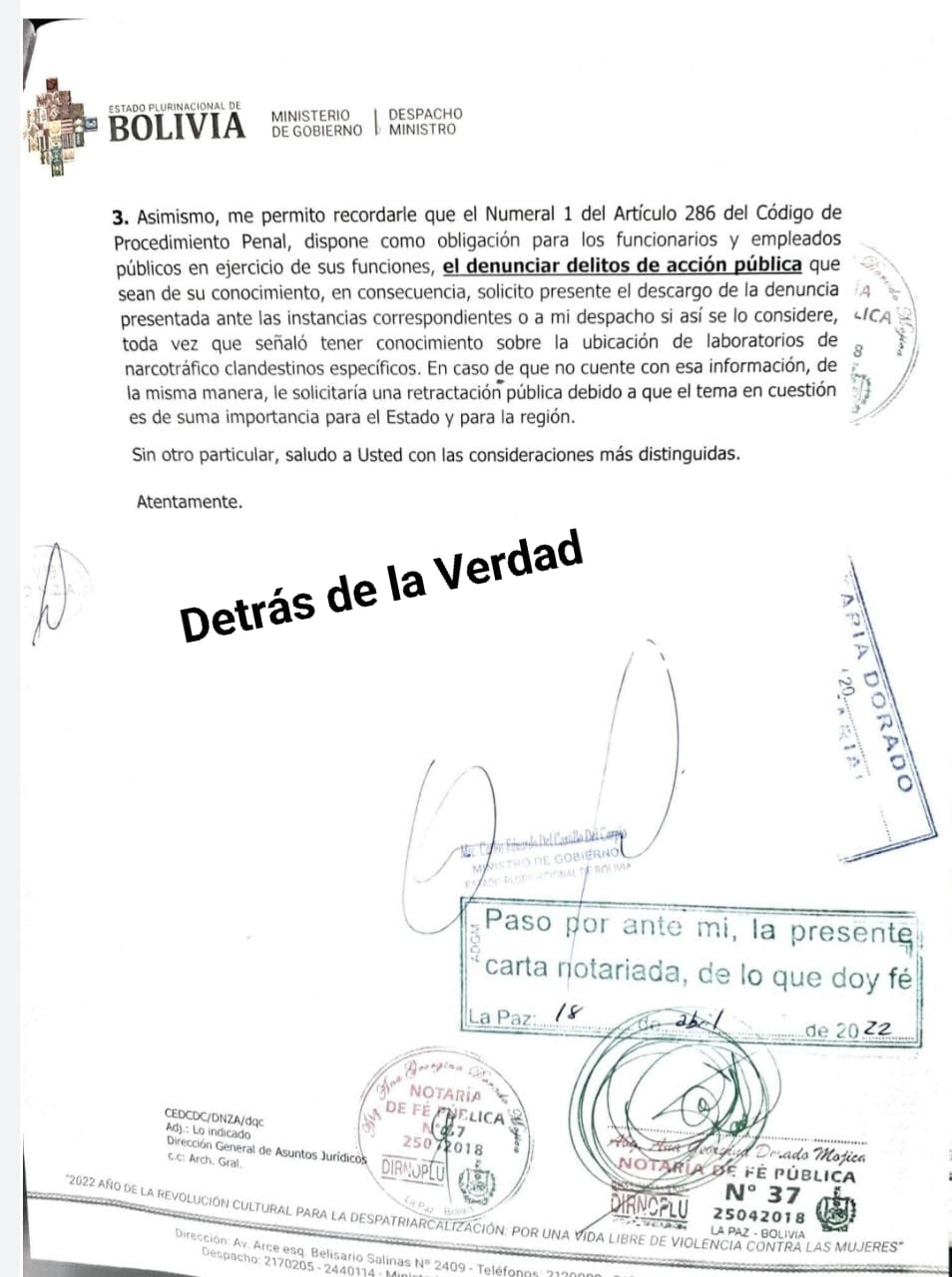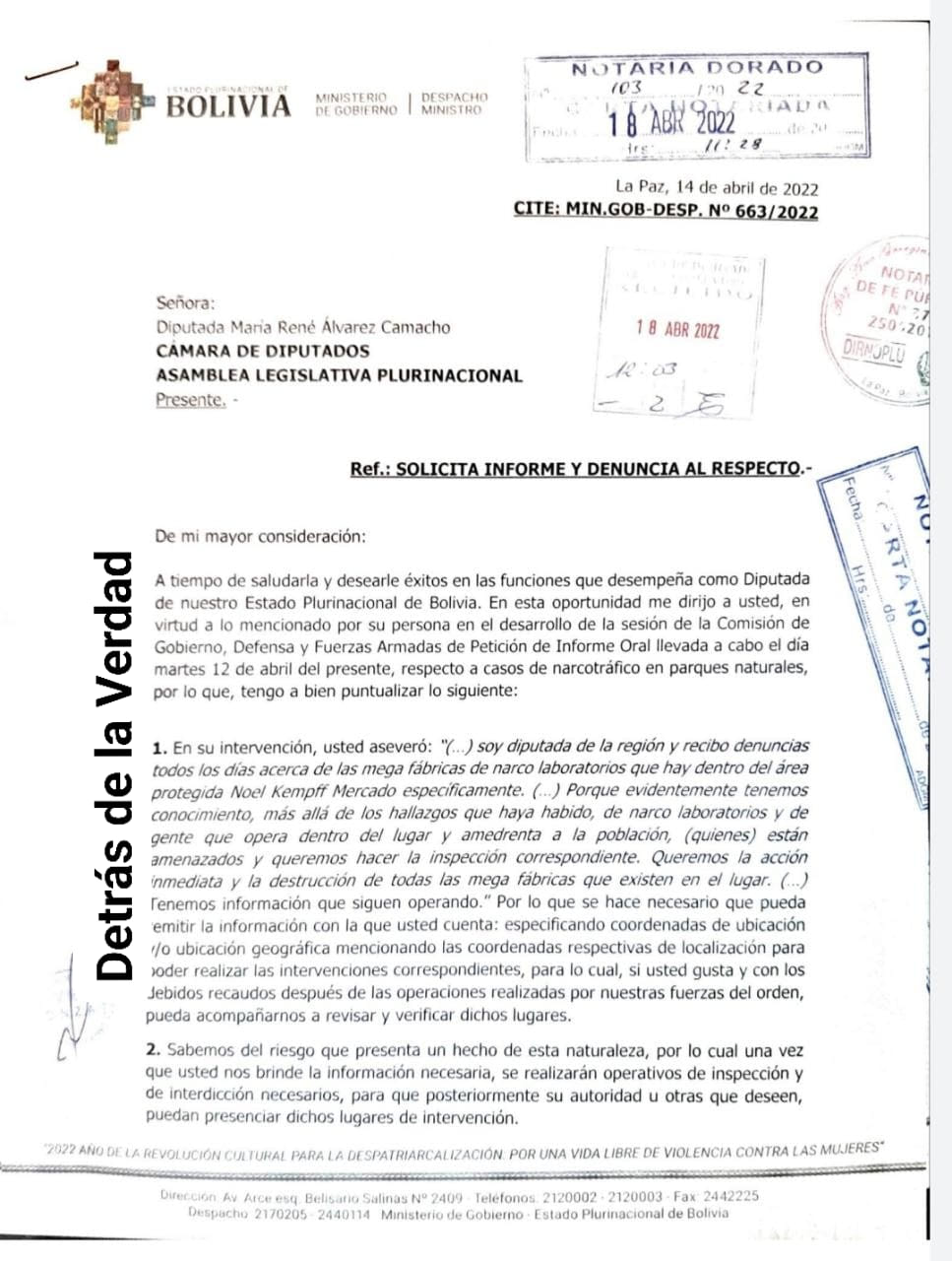El Ministro de Gobierno Eduardo del Castillo, envió una petición de informe a la diputada de Creemos, para que esta brinde detalles de los laboratorios de droga existentes en el parque Noel Kempff Mercado en el departamento de Santa Cruz, antes mencionados en un conferencia de prensa.