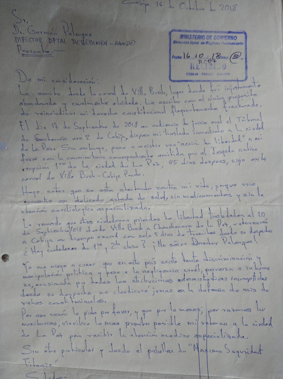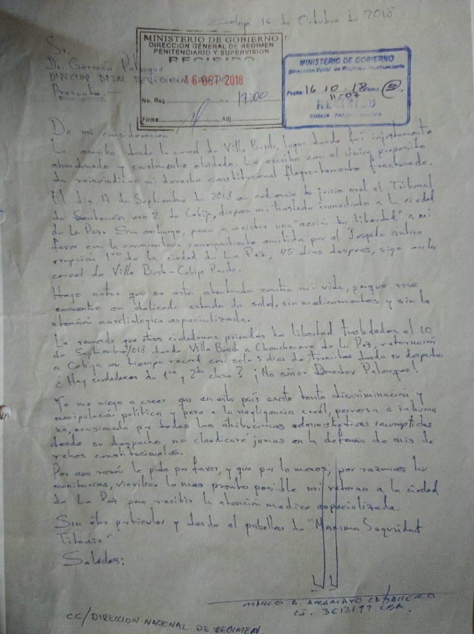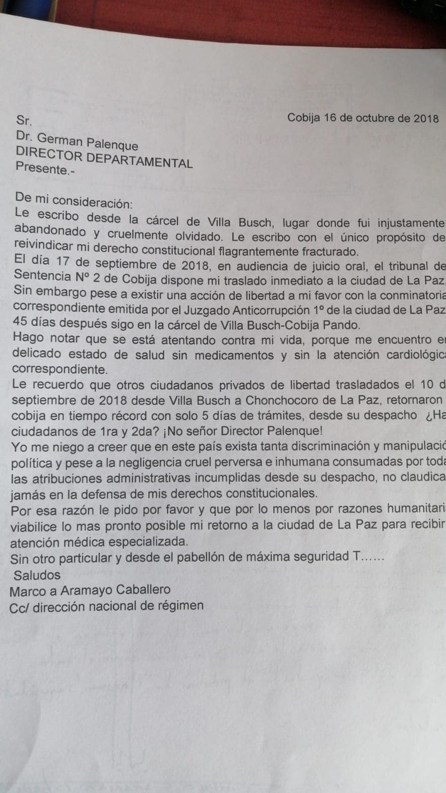 Difunden cartas del exdirector del Fondioc Marco Aramayo, en las que denunció que no le autorizaron el traslado de cárcel pese a tener un recurso a su favor y que tenía problemas de salud