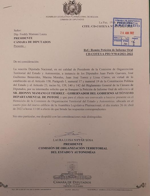 El gobernador de Potosí Jhonny Mamani, es convocado por la Comisión de Organización Territorial del Estado y Autonomías de #Diputados a rendir un informe oral sobre el caso ambulancias este martes 26 de abril a las 11:00 am.