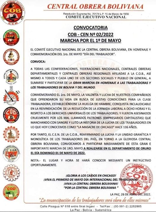 La Central Obrera Boliviana convocó a una marcha por el 1ro de mayo en conmemoración al Día del Trabajador. La marcha se realizará el domingo 1ro de mayo en el departamento de Oruro.