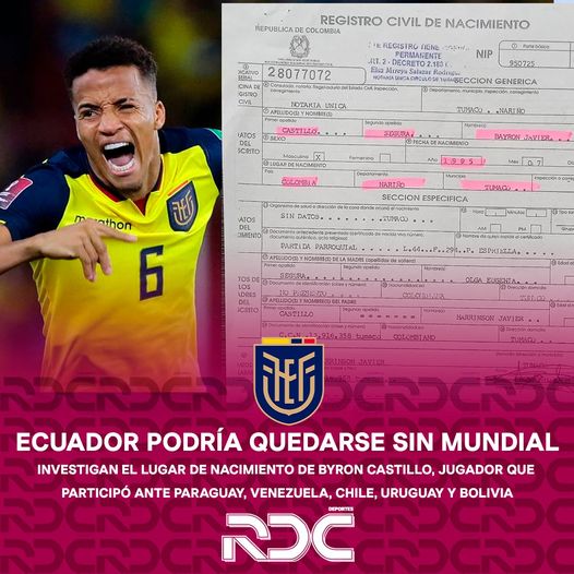 En Colombia y Chile surge la investigación de la nacionalidad de Byron Castillo, jugador que participó en varios encuentros para la selección de Ecuador. El problema surge tras encontrar una acta de nacimiento del jugador que indica que es colombiano, además de que Castillo aparentemente no tendría documento de identidad ecuatoriano.