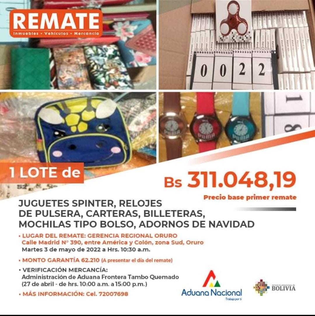 *Oruro, 27 de abril 2022. AN.* La Aduana Nacional iniciará un Proceso de Remate en Oruro y puso en exhibición para la puja un lote conformado por cuatro ítems en juguetes, dos en relojes de pulsera para dama y varón, un ítem en carteras, billeteras, mochila tipo bolso y dos en adornos de navidad, esferas navideñas, cintas y velas con adornos. El proceso se llevará a cabo el martes 3 de mayo en la Gerencia Regional Oruro, ubicada en la calle Madrid Nº390, entre América y Colón, a partir de las 10:30 de la mañana.