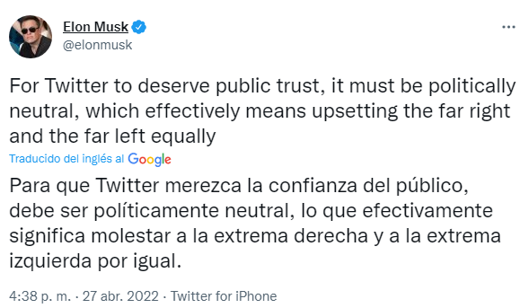 🔵#ANF | #Internacional Elon Musk, dueño de #Twitter, señala que para que la red social merezca la confianza, debe ser políticamente neutral. https://t.co/b8CMN1BqZf
