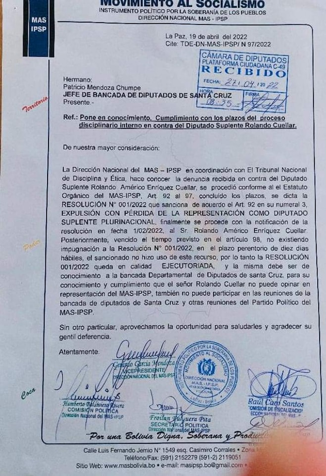 El MAS a través de su jefatura nacional envía carta a bancada del MAS en Santa Cruz mediante la cual hace conocer la resolución 001/2022 donde ratifica la expulsión del MAS del diputado Rolando Cuellar.