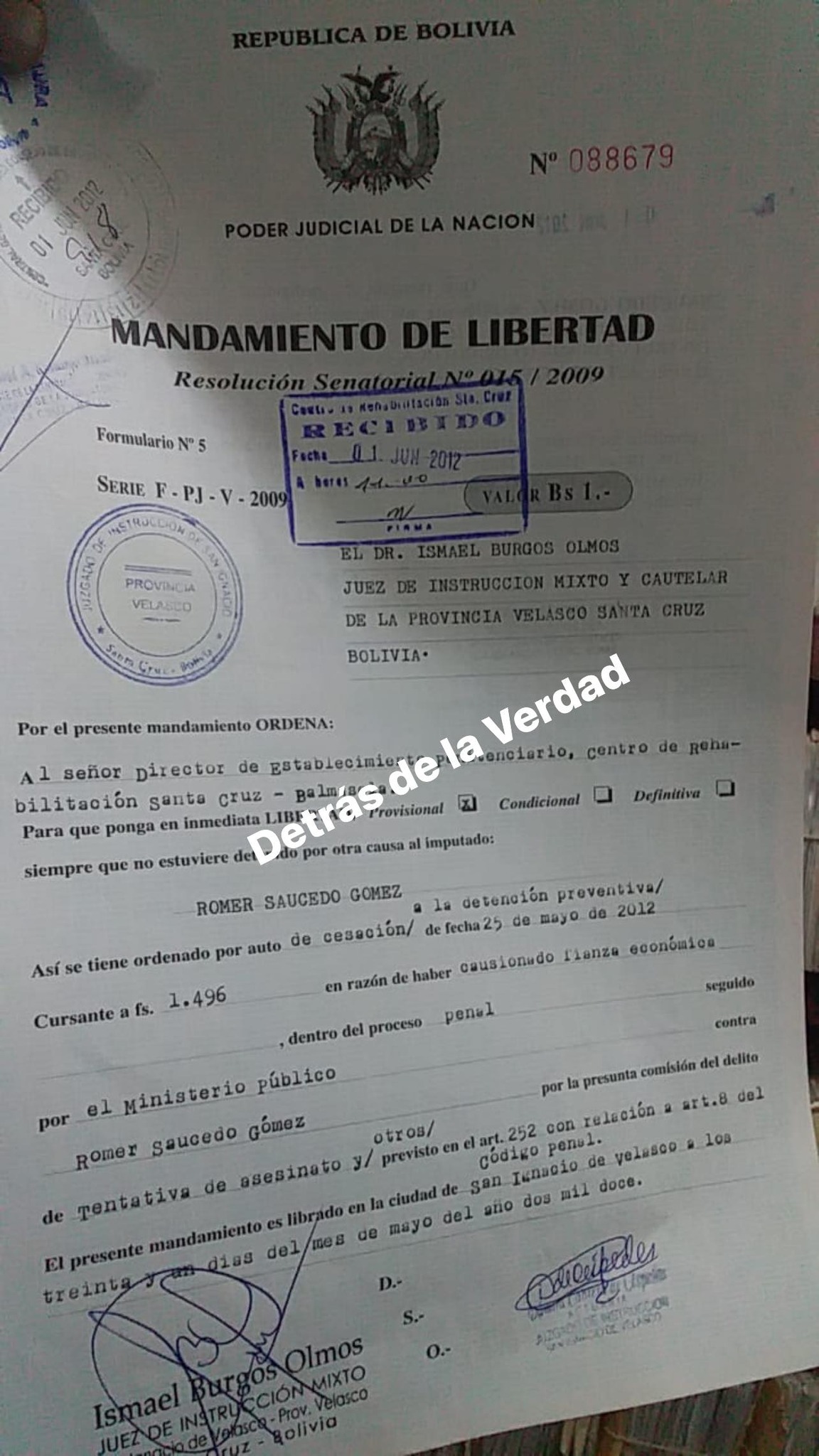 De acuerdo al expediente, el juez de Instrucción Mixto de San Ignacio de Velasco, Ismael Burgos, emitió su mandamiento de libertad en fecha 31 de mayo del 2012.
