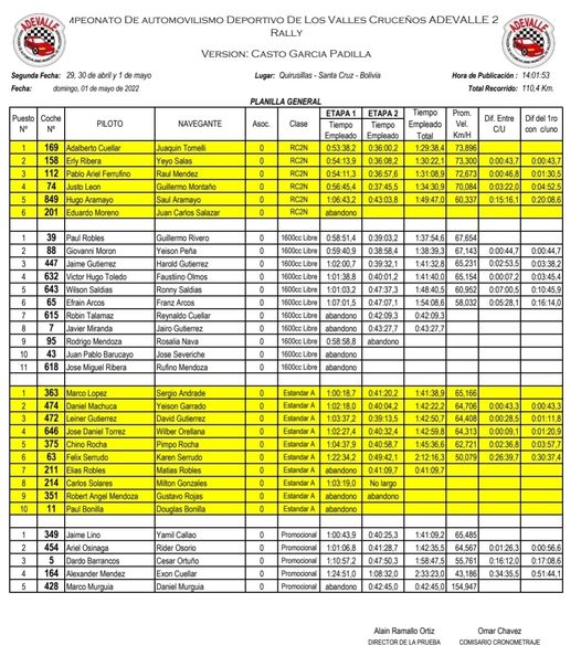 Resultados finales del Rally Quirusillas, válido por la segunda fecha del calendario de Adevalle Santa Cruz Bolivia