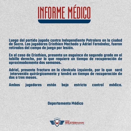 2 bajas sentidas en Wilsterman que se alista para jugar el clásico de Cochabamba.