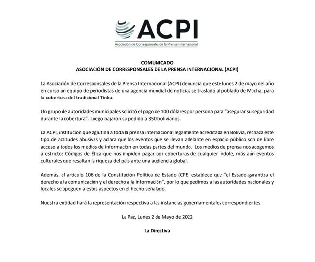 Corresponsables de Prensa Internacional denuncian que se les pidió $us. 100 para garantizar seguridad en un acto en Bolivia
