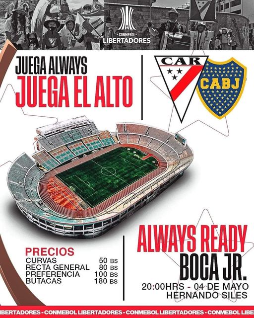Estos son los precios de las entradas para el partido entre Club Always Ready y Club Atletico Boca Juniors que se juega hoy desde las 20:00 en el Hernando Siles.