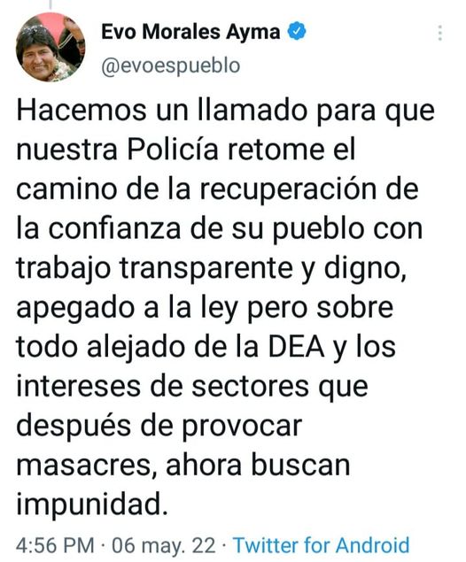 Evo pide a la Policía recuperar la confianza del pueblo, pero lejos de la DEA