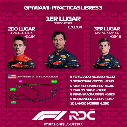 PEREZ AL FRENTE 🏁🇲🇽🇺🇸 Un practica marcado por el accidente de Ocon, el mexicano Sergio Perez se lleva el mejor tiempo de las libres 3 le siguen Charles Leclerc y Max Verstappen a las 16:00 hrs (Hora Bolivia) es la clasificación del F1 Miami Grand Prix. #RDC #RedacciónDeportes